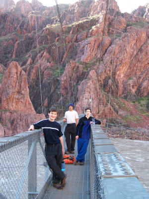 The last mile down GC05_BlackBridge11.jpgthe Kaibab Trail is a leg burner and feet killer -- very steep. The Black Bridge at the bottom is a lot longer than you expect, but the kids really liked this part. The river was brown and full because of all the rain over the last few months. Normally, the water is low and clear. This is a rare sight these days.